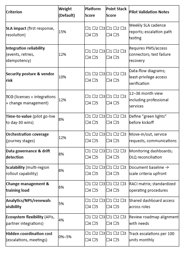 Think of a resident experience platform as a control tower coordinating workflows across multiple systems. Integrations become the arteries delivering real-time events to the right team at the right moment. This guide provides a decision-ready matrix that weighs operational outcomes, risk profiles, and total cost of ownership. Use it to compare a unified platform with a stack of specialized tools, then validate your choice through a pilot that proves scale economics beyond license costs.